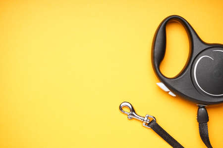Black retractable dog leash on a yellow background, space for text. Close-up. Flat lay.