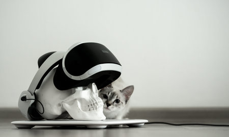 white skull on a stand in a VR helmet. Gray cat Digital concept.