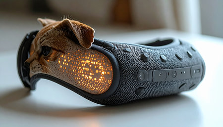 A dog relaxes inside a futuristic, high-tech pet house, showcasing modern design and technology.