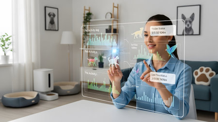 Pet technology showing woman using futuristic holographic interface for pet activity and feeding...