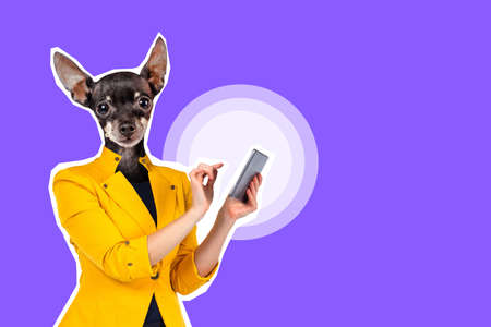 Collage of modern art, modern design. A woman with a dog head collage. Small dog uses tablet pc. A dog in a women fashion suit. Magazine style. Lilac background with space for text.