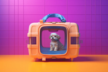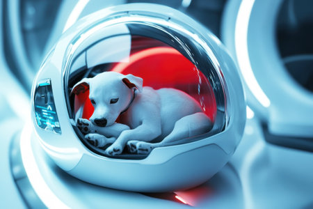 A small white dog rests comfortably inside a sleek, high-tech capsule with glowing accents.