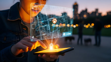Woman views holographic pet tracking map on smartphone in park with city skyline. Clear details a...