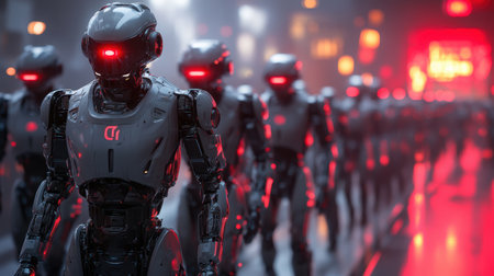 In a bustling, neon-lit metropolis, advanced AI robots walk in synchronized formation. Their glowing red eyes illuminate the dark streets, showcasing cutting-edge technology and design.