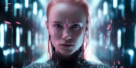 A striking portrait of a futuristic woman with a sleek bob haircut and robotic features. The cybernetic aesthetic is enhanced by striped light projections on her face and a metallic collar, representing artificial intelligence and sci-fi concepts.