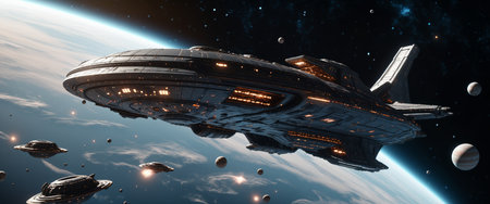 Futuristic spaceship with glowing lights orbiting earth in a dark cosmic environment