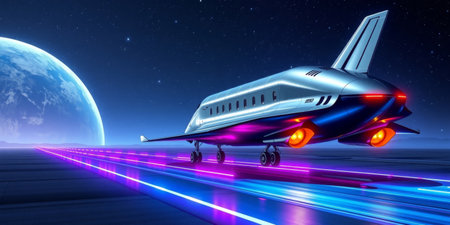 A stunning scene of a futuristic spacecraft poised for launch on a vibrant runway, illuminated by neon lights against a backdrop of a mesmerizing moon.