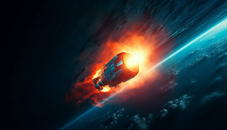 Space travel vehicle orbiting planet with technology.