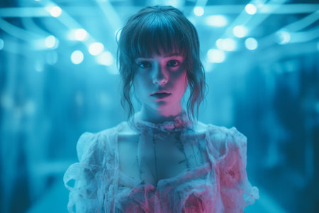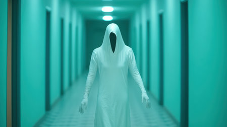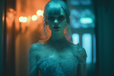 Horror movie and poltergeist creative advertising concept. Portrait of a female ghost in a house. Woman in white dress covers her head with a veil or white veil. Blue horror light.