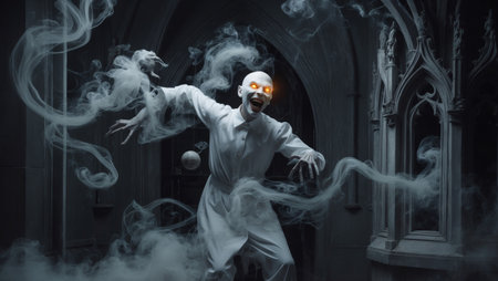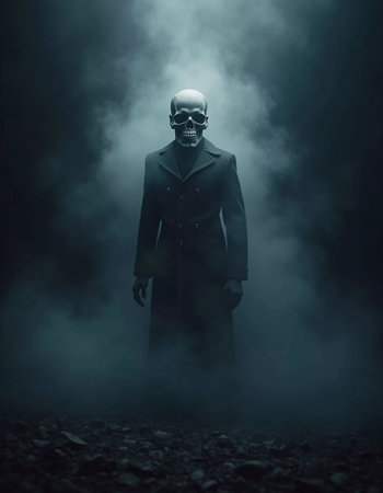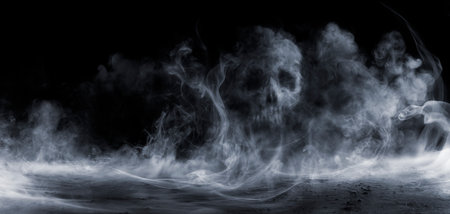 Mysterious skeletons in thick fog creating eerie atmosphere and haunting scene. concept of halloween decor, spooky mood, chilling ambience.