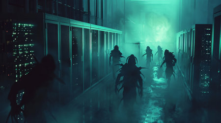 Shadowy silhouettes emerge amid dense fog in a moonlit woodland, creating an eerie, silent scene imbued with intrigue and nocturnal secrets.