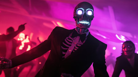A mystical figure adorned with striking skull makeup creates an intriguing atmosphere of mystery