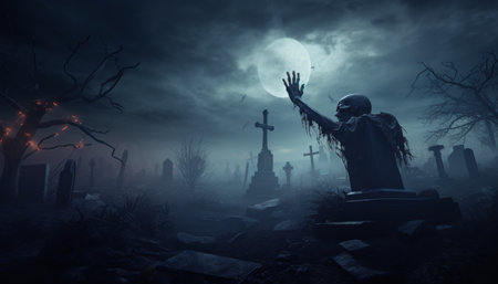 Eerie zombie hand emerges from grave beneath a full moon in a foggy graveyard scene at night