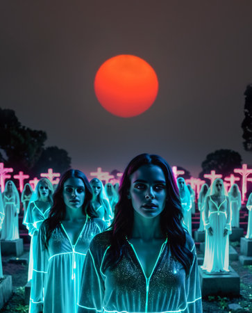 Fashion model wearing a flowing black dress poses elegantly in a dark forest, bathed in the glow of neon lights, creating a captivating and mysterious atmosphere filled with intrigue
