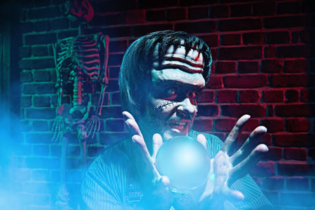 An ugly man with scars on his face - an obsessed scientist works in his laboratory with an energy ball. A medieval alchemist is looking for the elixir of youth. Halloween.