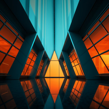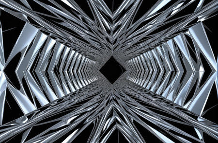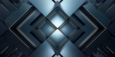Symmetrical abstract image featuring dark, reflective surfaces and geometric shapes. Clean lines and cool tones create a modern, architectural feel, ideal for design projects.