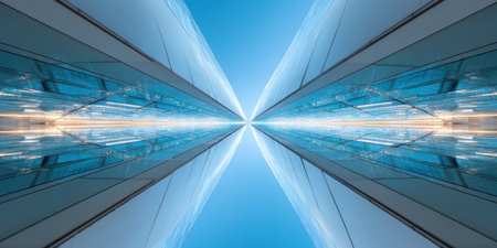 Symmetrical, low-angle shot of modern architecture reflecting a vibrant blue sky