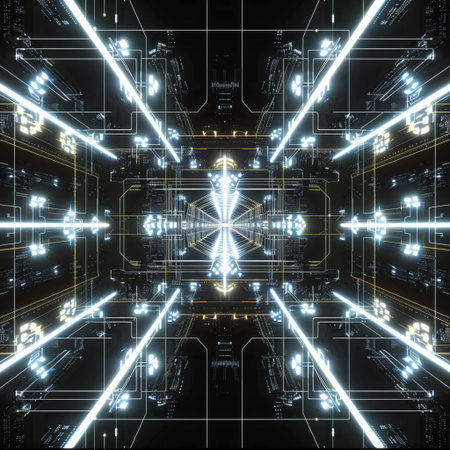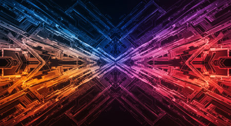 futuristic technology background with digital mirrored and symmetry patterns and cyber glow, innovative tech backdrop with tunnel and warp virtual network design and electronic light