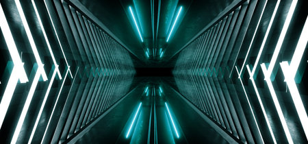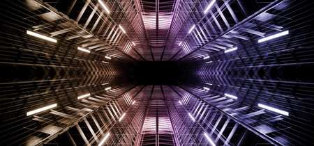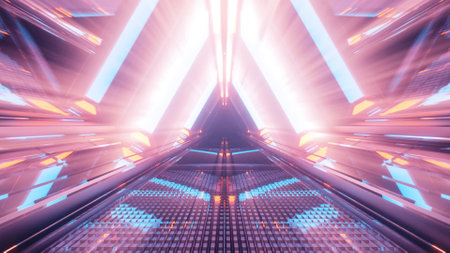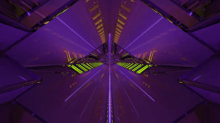 Triangle Neon Laser Fluorescent Purple Yellow Blue Glowing Sci Fi Futuristic Warehouse Hangar Spaceship Realistic Showroom Steel Metal Frame Corridor Tunnel Dark Underground Basement 3D Rendering illustration
