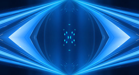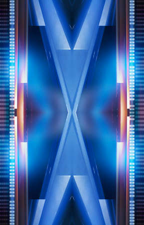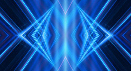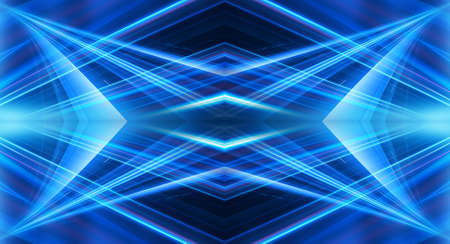 Dark background with lines and spotlights, blue neon light, night view. Abstract blue background. Futuristic modern patterns, symmetrical reflection.