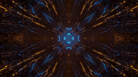 futuristic technology background with digital mirrored and symmetry patterns and cyber glow, innovative tech backdrop with tunnel and warp virtual network design and electronic light, blue and gold