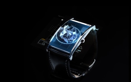 modern technology, science, object and media concept - close up of black smart watch with polygonal shape projection over screen
