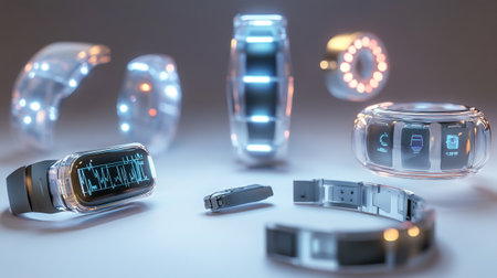 Futuristic smart watches on white table. 3D rendering.