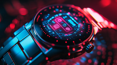 Close up view of a modern smart watch with blue and red neon lights