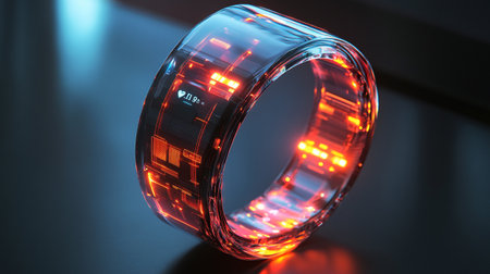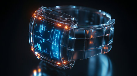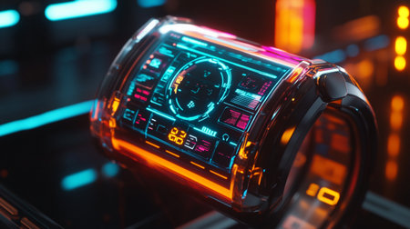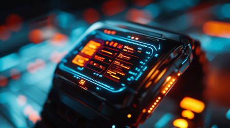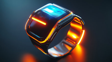 Futuristic smart watch with blue and orange light on the screen
