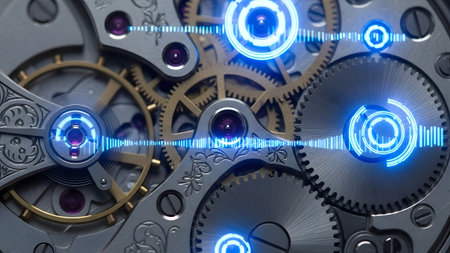 Mechanism showing intricate watch mechanism with glowing blue digital interface and sound waves....