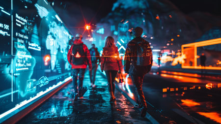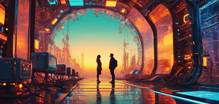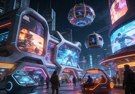 A vibrant cityscape showcases robots and humanoids amidst holographic displays. The artwork features a futuristic aesthetic with neon lines, digital interfaces, and architectural elements. The lighting emphasizes the technological theme, hinting at innovation. Suitable for various applications, including editorial and commercial design projects.