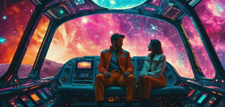 Pilot and his female assistant are sitting in the cockpit of a spaceship.