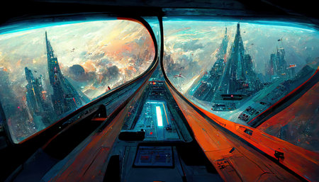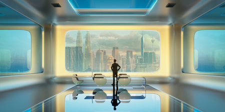 3D rendering of a futuristic spaceship interior with a view of the city
