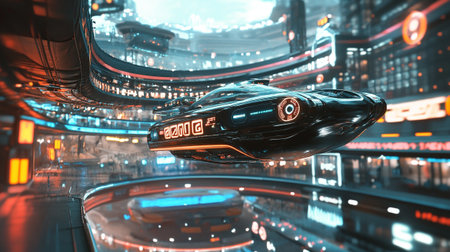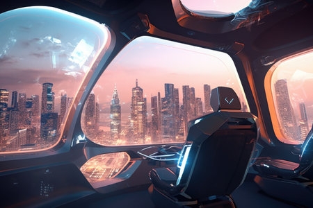 aliens traveling in flying vehicle of the future, with the view of futuristic city visible through window, created with generative ai