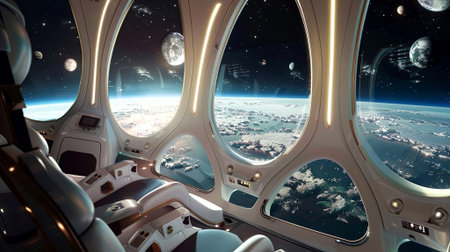Step into the future with a breathtaking view from a luxury space shuttle, showcasing Earth and galaxies beyond. The ultimate space journey begins here. Generated A.I.
