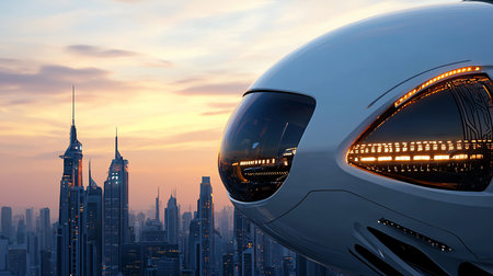 Advanced city with sleek flying vehicles hovering above, showcasing a dynamic skyline illuminated by sunset colors and high-tech architecture in the background.