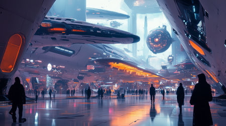 A bustling futuristic spaceport filled with travelers and spacecraft, showcasing advanced technology and intergalactic travel.
