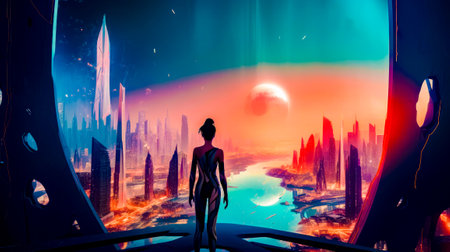 Woman standing in front of futuristic cityscape with river running through it. Generative AI.
