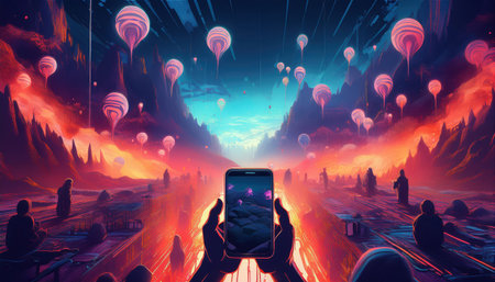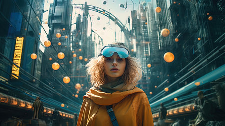 A vibrant digital city scene with VR headsets and AR glasses, showing the immersive potential of virtual reality technology.