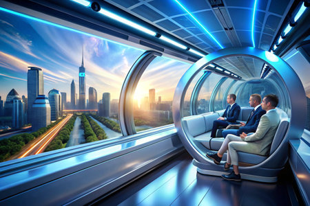 Future Transportation Pod. Sleek white autonomous transport capsule moving through illuminated futuristic tunnel with blue lighting and reflective surfaces.