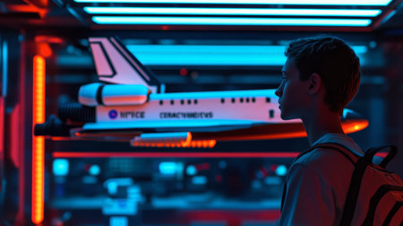 A young boy stands in awe beside a futuristic space shuttle model, immersed in a world of imagination and innovation. The vibrant neon lights create an inspiring atmosphere for exploration and creativity.
