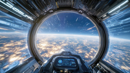 A stunning view of Earth from spaceship cockpit, showcasing lights and speed