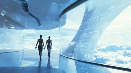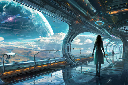 A futuristic space hotel orbiting Earth, with tourists gazing out of large viewports at the planet below. Generative AI