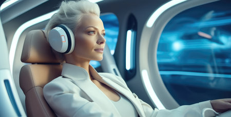 Woman are ride in a self-driving car controlled by an artificial intelligence autopilot, Future technologies.
