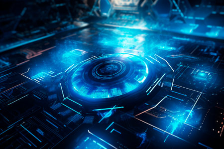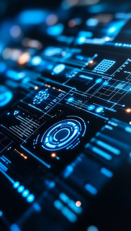 Futuristic digital interface featuring glowing blue lights and abstract technological background