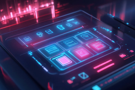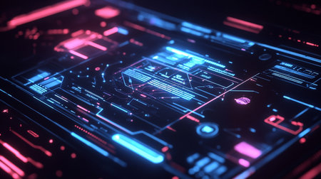 A vibrant futuristic digital interface featuring neon lights in blue and red, perfect for technology and innovation themes in digital design projects.
