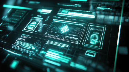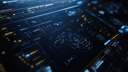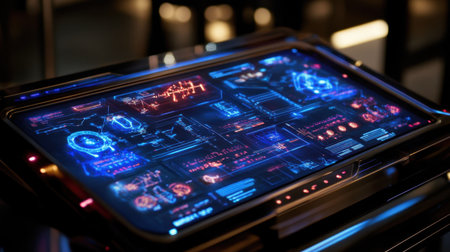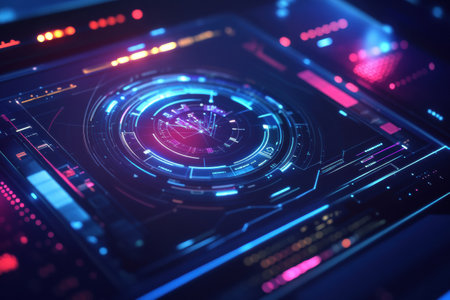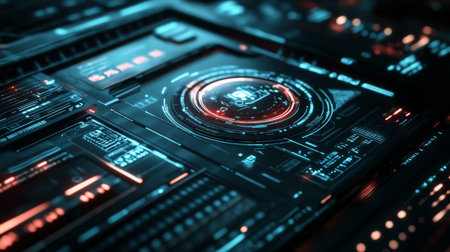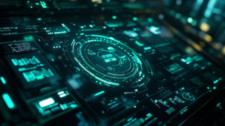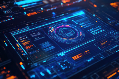 A captivating futuristic digital dashboard showcasing glowing interfaces and high-tech elements ideal for themes of data analysis, cybersecurity, and technological advancements.