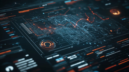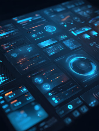 This image showcases a futuristic digital interface with numerous data elements and informational displays. The composition is characterized by a dark background with vibrant, glowing elements and lines. The image employs a modern, technical style suitable for various design, technology, or informational applications.