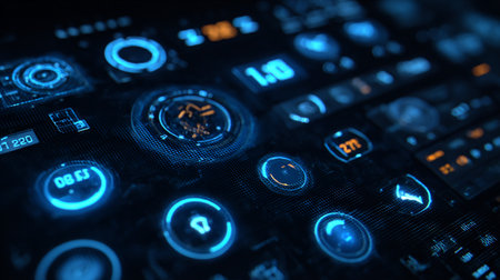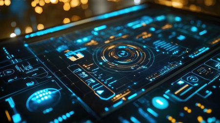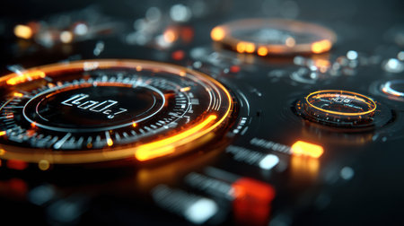 High-tech interface close-up showcasing glowing circular elements, buttons, and displays.