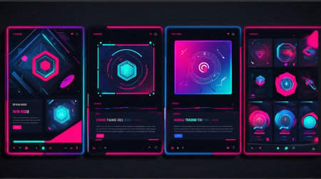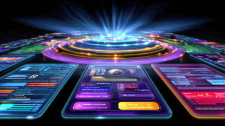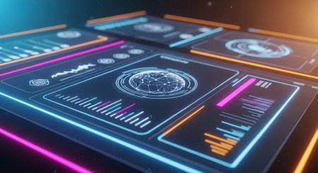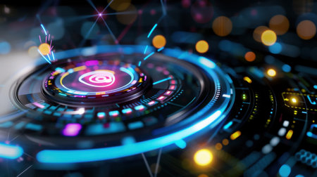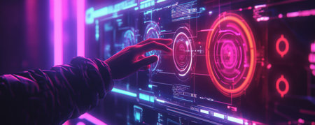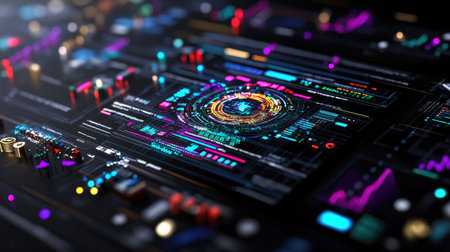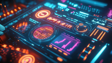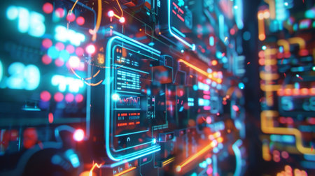 This image showcases a high-tech digital interface featuring vibrant neon visuals and intricate data representations, ideal for technology and innovation themes.
